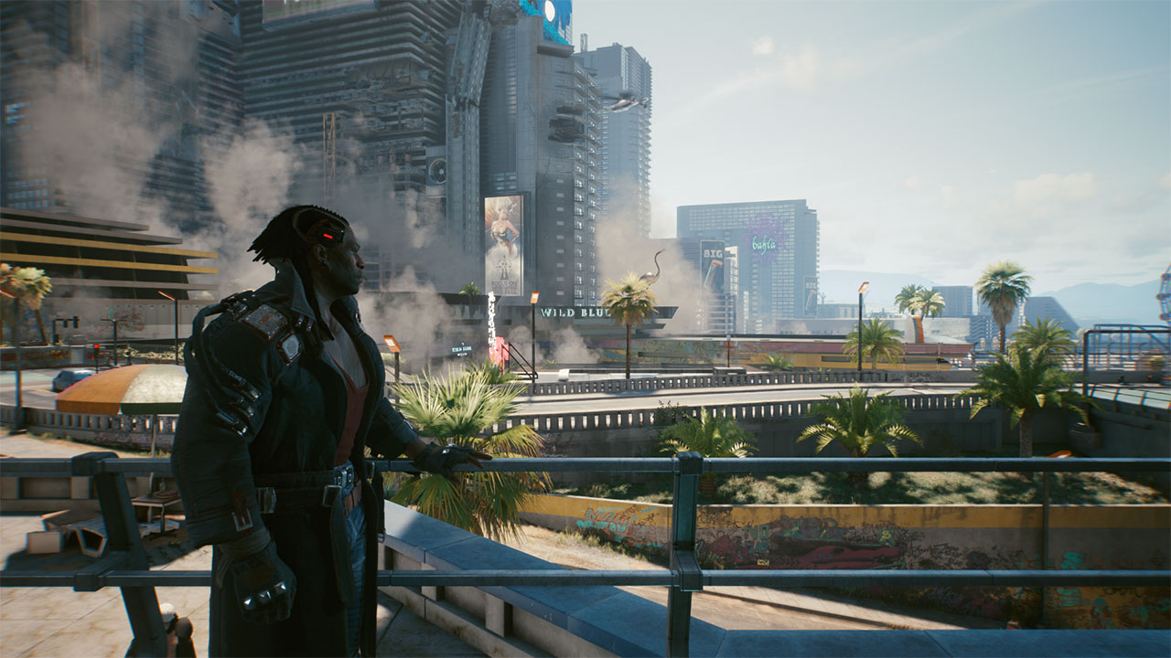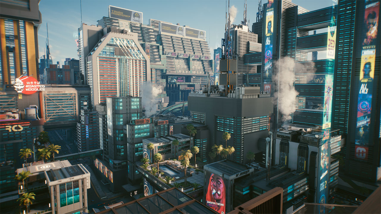 Grundsätzlich gelingt es den Entwicklern ein stimmiges Bild einer hyperkapitalistischen Metropole zu zeichnen, zumindest was die Optik und teilweise das Auditive betrifft. Unzählige Assets erschaffen die Stadt Night City und ihr Umland im ausgedorrten Bundestaat Kalifornien. Gigantische Gebäude bilden ein vielversprechendes Gefäß, das wie Pondsmith 2012 selbst mahnte, nicht einfach zu füllen ist. Cyberpunk sei ein Synonym für Komplexität.
