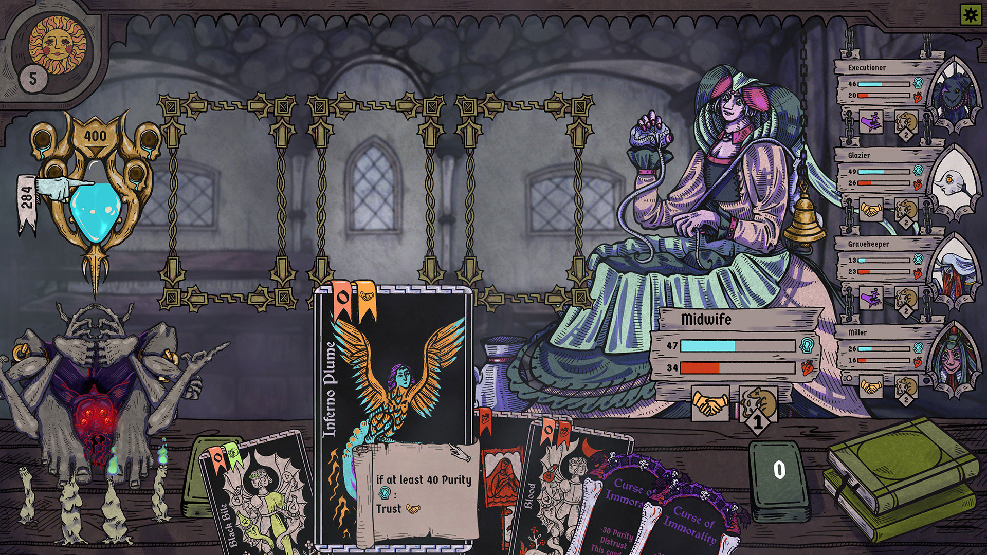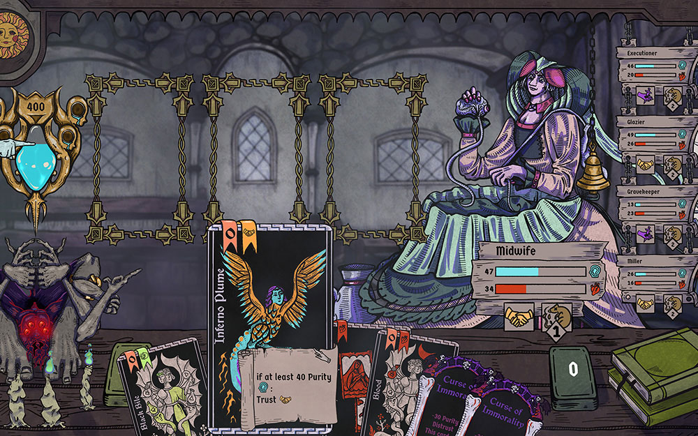 Zu Beginn eines jeden Tages erscheinen bis zu fünf Dorfbewohner, deren Zustand aktiv verwaltet werden muss. Gesundheit, Reinheit, Vertrauen und Krankheit greifen dabei unmittelbar ineinander und bestimmen, wie effektiv die Spielerin agieren kann. Da bereits der Verlust entweder Gesundheit oder Reinheit den Tod eines Bewohners nach sich zieht, wird jede Entscheidung zur Abwägung zwischen kurzfristiger Stabilisierung und langfristiger Planung.