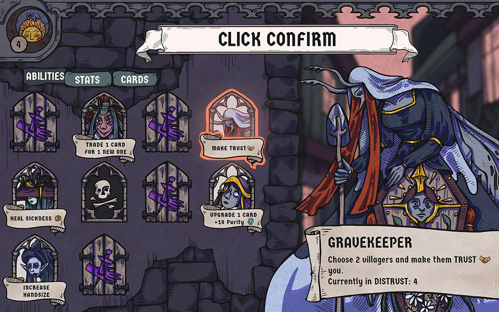 Misstrauen besitzt dabei eine doppelte Funktion. Jeder der Dorfbewohner stellt zwischen den Spielrunden eine Fähigkeit zur Verfügung, die der Spielerin strategische Optionen eröffnet. Diese reichen von klassischen Deckbuilder-Elementen – etwa Karten entfernen, Karten aufwerten oder die Handkartengröße erhöhen – bis hin zu spezielleren Eingriffen wie dem Entfernen von Krankheiten, dem Wiederherstellen von Vertrauen oder dem gezielten Bestimmen der Besucherreihenfolge für den nächsten Tag. Sinkt das Vertrauen eines Bewohners, kann die Spielerin für diesen nur zwei Karten ausspielen, zudem wird dessen Fähigkeit blockiert. Krankheit wiederum wirkt sich direkt auf die Gesundheit aus und verstärkt den nächtlichen Lebensverlust, was den schnellen Tod eines Bewohners zur Folge haben kann.
